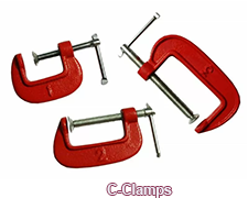 C-CLAMP: Describes a tool which is in the shape of the letter "C". A screw at one end of the clamp forces the end of the screw against the object to be secured.