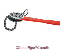 <CHAIN PIPE WRENCH: Describes a chain wrench that circles a pipe and grips it so that the tube can be tightened or removed.