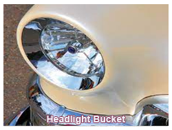 HEADLIGHT BUCKET: Describes the headlight housing of classic cars having separate headlights not integrated into the body line