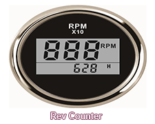 REVOLUTION COUNTER (RPM): Describes a tachometer whose role is to measure the engine speed in revolutions per minute.