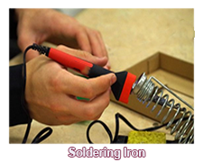 SOLDERING IRON: Describes a metalworking tool with a copper or iron tip which is heated, electrically or in a flame, and used to melt solder to make joints.