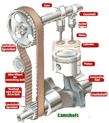 Connected to the crankshaft through either the timing belt or chain, the camshaft comprises a number of radial cams, each of them either t exhaust valves or fluid input valves.