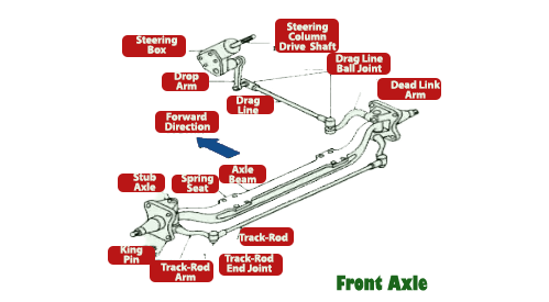 The role of the front axle is simpler to the rear - to take its share in bearing the weight of the vehicle as well as facilitating its steering and absorbing shocks caused by road surface variations.