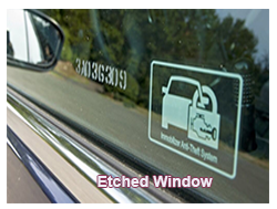 WINDOW ETCHING: Describes a security measure worth investing for rare and/or expensive vehicles where the vehicle’s registration number is permanently marked by etching, sometimes in several places, into the glass surface of the windows.