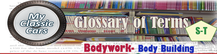SCUTTLE SECTION: Describes the sub-assembly of a body shell, taking in the bulkhead, scuttle, and windscreen pillars, often preassembled during the production process and spot-welded with the other sub-assemblies to form the body shell.