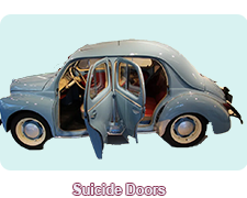 SUICIDE DOORS: Describes a style of front and back door combination popular in the pre-war years. Both sets of doors have their hinge toward the back of the vehicle, creating an increased possibility of a passenger falling or jumping out of the vehicle when it is moving at high speed.