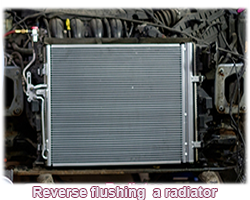 Describes the process of circulating water through the cooling system under pressure to remove old coolant along with any dirt or rust.