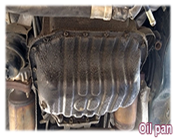 OIL PAN: Describes the removable cast alloy metal chamber found at the bottom of the crankcase into which the oil drains.