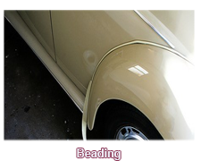 BEADED EDGE: Describes the edge of a body panel or upholstery panel wrapped around a wire or other stiffening item.
