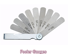 FEELER GAUGE: Describes a thin strip or blade of hardened steel, ground to an exact thickness, used to check clearances between parts. The thicknesses increase by 0.001 inches.