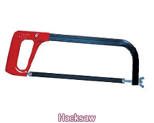 HACKSAW: Describes a tool used for cutting metal, with a narrow blade attached to a frame.