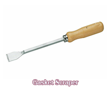 GASKET SCRAPER: Describes a scraper with a sharp chisel edge used to remove old gasket material from a surface before applying a new gasket.
