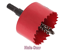 HOLESAW: Describes a cylindrical-shaped saw for use with power tools to cut holes in sheet metal material, particularly for the installation of aerials.