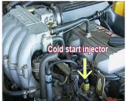 COLD START INJECTOR: Describes a device in a fuel injection system that shoots an extra amount of fuel into the cylinder to increase the ratio of fuel to air.