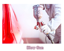 BLOW GUN: Describes a paint spray gun with a wide nozzle fed by air pressure used to blow out crevices in material that is otherwise hard to reach.