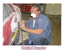 ORBITAL SANDER: Describes a flat, cushioned plate covered with abrasive paper that rotates in an elliptical motion, used for fine sanding work such as feather edging.