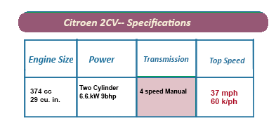 Over the years Citroen's engineers gradually increased the 2CV's engine's power, with the car eventually fitted with a 602 cc air-cooled version, generating 29 bhp and reaching speeds not recommended on Frances' vast network of rural country roads.