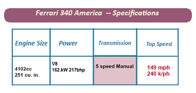 The 340 America was powered by a 4.1-liter Lampredi-designed unit, capable of an output of between 220 to 220 bhp. Capable of reaching a maximum speed of approximately 150 mph (240 km/h), the 340 America which positioned it as one of the swiftest production cars during its era.