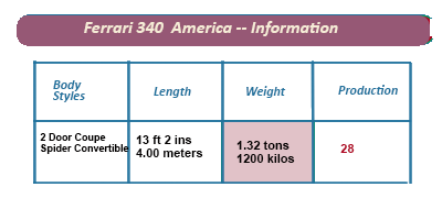 The 340 Americas, based on the 166/195/212 chassis, were the first Ferrari road cars to be fitted with an Aurelio Lampredi-designed engine, a 4101cc 250 cubic inch engine coupled with a 5-speed gearbox driving through a rigid rear axle.