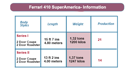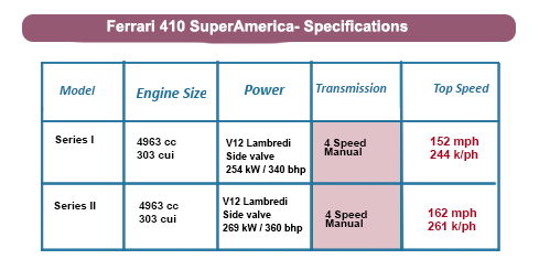 The new 410 SuperAmerica made its debut at the Brussels Motor Show in 1960. Replacing the 410, the new car used a shortened 250 GT chassis and a larger, 3967cc (242 cu in) version of the shorter Colombo-designed V12 in its most developed form.