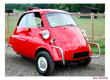 Isetta Bubble Car, a car for two people with a front door. Production got under way in 1954, with sales steady although facing strong competition from BMW among others.