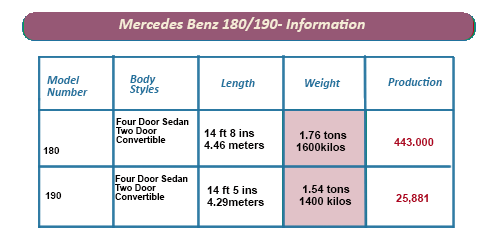 Often referred to as "Pontoons" because of their boat like shape. the 180-190 pair were the mainstay of Mercedes' lineup during their production runs. Between 1953 and 1959, the Pontoons made up for well over half of the company's production output.