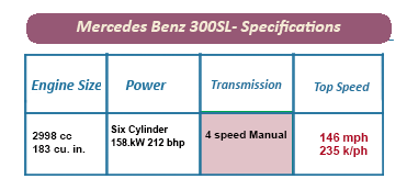 With the power to match its looks, the 300SL was reportedly capable of reaching speeds of around 250 kilometres an hour ( 150 mph) although Mercedes were only prepared to guarantee about 220 kph (130 mph) from a 3 litre 193 cubic inch engine.