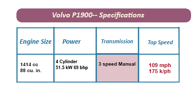 The same 1.4-litre powered the Volvo P1900 (86 cu in) B 14 engine fitted on the PV444 with a power boost coming from a pair of SU carburettors that increased the car's power to 52kW (70bhp).