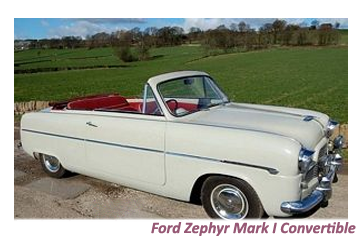 A two-door convertible of the Consul and Zodiac produced for Ford by Carbodies of Coventry, went on sale in 1953, with the car becoming a great favourite of the “ Teddy Boy” generation with money in their pocket to spend on a “ head turner”.