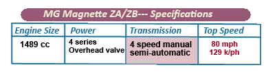 In 1956, MG replaced the Magnette ZA version with the ZB. Whilst looking exactly the same as the ZA, through fitting 1½ inch carburettors, power on the ZB was increased to 64 bhp (48 kW), increasing the car’s top speed to 86 mph (138 kmh).