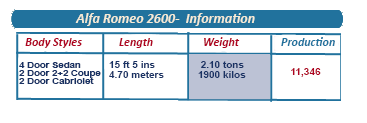 In what had now become a proven Alfa Romeo format, the 2600 range comprised a salon, coupe and Spider Softop.