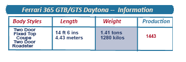 The Ferrari 365 GTB fixed head coupe and GTS Spyder open top was introduced at the Paris Motor Show in 1968 to replace the 275 and 330 series.
