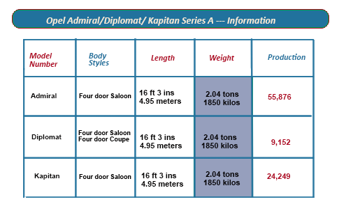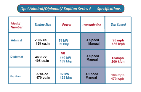 In 1964, Opel released the latest versions of their luxury class Admiral, Diplomat and Kapitan saloons, all of them under the A Series label.