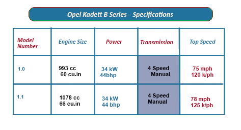Opel also offered the Kadett B with a 1078 cc engine that could generate 55 bhp, later adding an extra carburettor to chase the power up by an additional five bhp.