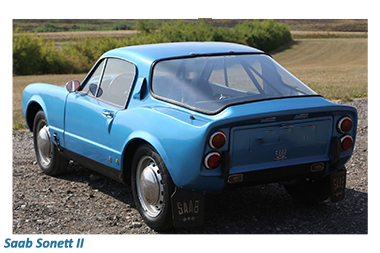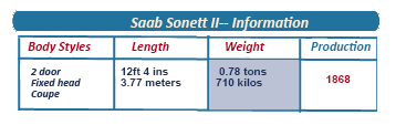The Saab Sonett II coupe body was constructed entirely of fiberglass with sharply truncated, "sawed-off" back end and a large wraparound back window.