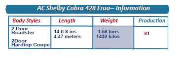 Throughout their long history, AC had meticulously maintained their tradition of producing only" two-seaters" and the Cobra 428 Frua was no exception, although this model sat on a wheelbase six inches longer than the 427.