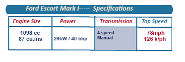 Available with a wide choice of engines from the starter level, 1098cc and a more powerful 1298cc or even the 1298cc GT-tune, the 72bhp GT matched to closer-ratio gears and disc brakes on the front wheels, the Escort Mark I was available initially only with 4-speed manual transmission as standard on all engine configurations.
