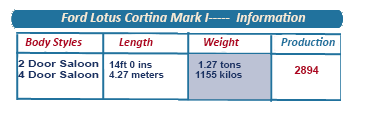 The first the Lotus-Cortinas were almost entirely different from the regular two-door Ford model, considerably lighter, thanks to the aluminium body skin panels specially created for the doors, bonnet and boot lid.