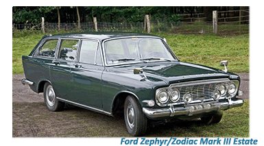 A five-door estate car derivative was available on both types from late 1962 — all of them (including the Zephyr 4 version) using Zodiac rear doors and having lift-up tailgates produced in glass fibre.