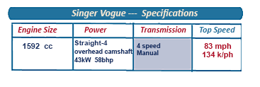 The Singer Vogue used the larger body soon to become familiar in the Hillman Super Minx, and, although only 11 inches wider than the Gazelle shell, it offered much-increased accommodation with its 5-inch greater wheelbase.
