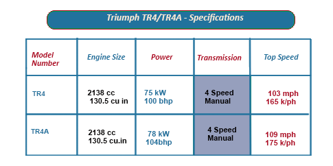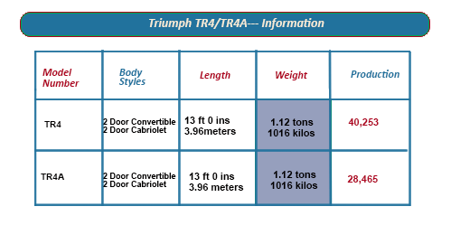 The Triumph TR4 remained in production in its original format until January 1965 when replaced by the Triumph TR4A.