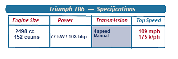 In all markets apart from the United States (due to emission rules), the TR6’s 2,498-cc, six-cylinder engine was fuel injected, capable of producing 150 bhp and capable of taking the car to 120 mph (190 kph).