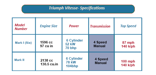 As a response, in 1962, the Triumph Vitesse was unveiled, a 159cc six-cylinder engine version of the Herald, with a strengthened chassis, disc and overdrive as an option.