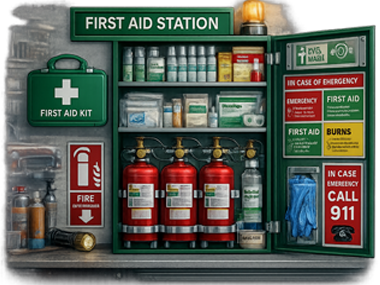 Complementing the emergency eyewash stations should be first aid stations, to ensure that minor injuries such as cuts, burns, and abrasions can be treated promptly and effectively. These kinds of injuries are quite common especially in mechanical and fabrication departments and having a well-stocked first aid station set up and ready to go will reduce the severity of injuries.