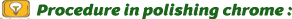 The normal procedure in polishing chrome trim requires two dry microfiber cloths- the first to apply the metal polish to one and gently work it into the chrome. Once stage one is completed it is recommended to leave it to it rest for a few minutes before wiping away the excess polish with the next cloth.