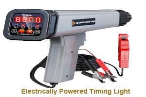 An electric timing light uses an inductive pickup clamped around a spark plug lead to detect ignition firing. A strobe light flashes in synchronisation with the spark, allowing the timing mark on the crankshaft pulley or flywheel to appear stationary when illuminated.
