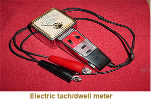 An electric tach/dwell meter measures engine speed (RPM) and distributor dwell angle by analysing ignition pulses. The dwell function indicates how long the breaker points remain closed during each ignition cycle.